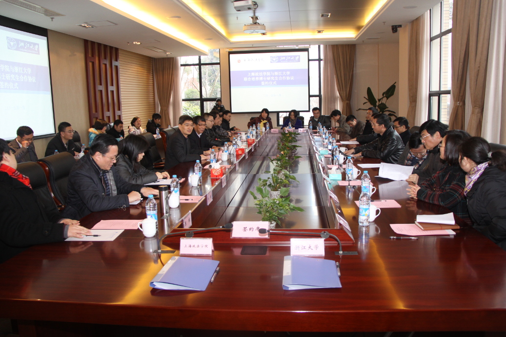 为实现优势互补,增强国际竞争力,依托设立在上海政法学院的“中国—上海合作组织国际司法交流合作培训基地”,发挥浙大学科综合的优势,携手致力于落实习近平主席的重大倡议,服务于国家外交战略和安全战略,1月14日,我校党委副书记严建华率领研究生院各处、本科生院、地方合作处、国际教育学院、光华法学院、公共管理学院及外语学院负责人一行13人赴上海政法学院,签署了针对来华留学生的博士研究生联合培养合作协议,先期将在法学、非传统安全学科领域开展联合培养项目。