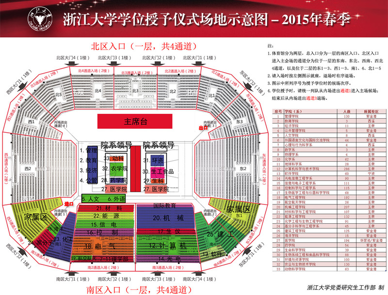 7.请各院系负责学位授予仪式组织工作的领导在3月27日下午3:00后到紫金港校区体育馆熟悉自己院系的场地和学位授予仪式程序。场地安排见附件。