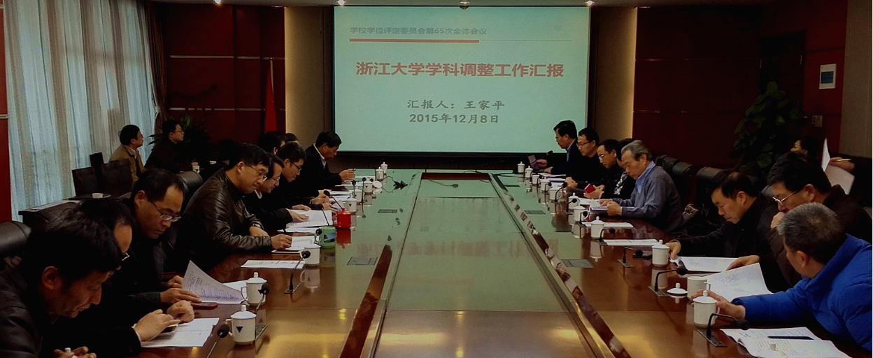 2015年12月8日上午,浙江大学学位评定委员会召开第65次全体委员会议,审议学科调整工作方案、省一流学科遴选工作方案、新版学位证书中英文文本方案,讨论十三五研究生招生发展规划。