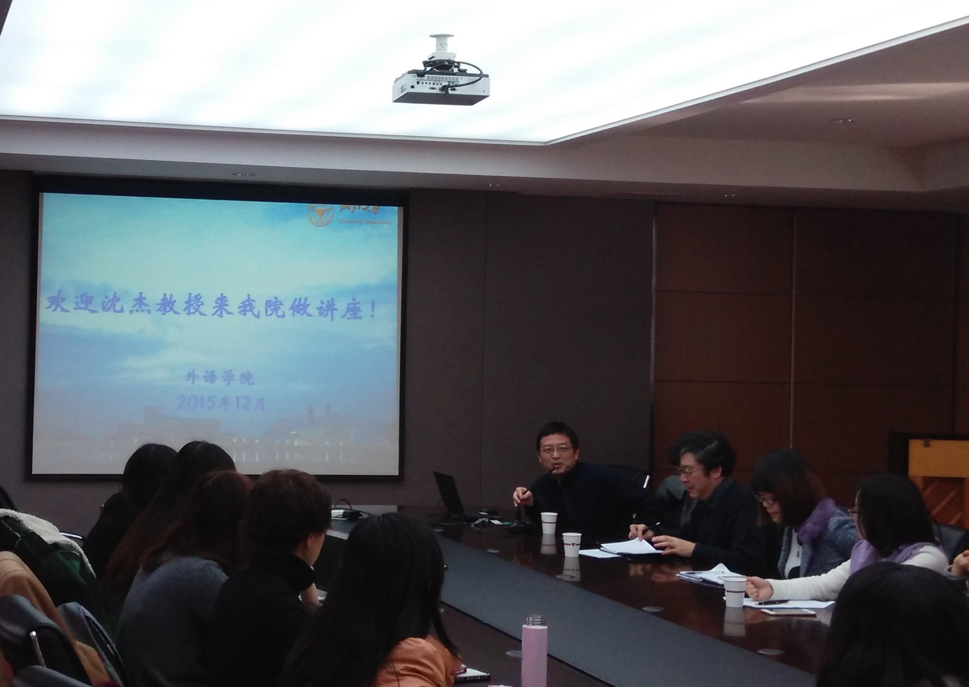 2015年12月25日下午,我校研究生培养处副处长沈杰教授应邀来到外语学院,为广大外院研究生带来了“开拓研究生国际视野,提升科研竞争实力”的专题讲座。讲座由外语学院副院长马博森教授主持。研究生院公派出国办公室主管刘多老师和外语学院研究生科傅利琴老师一起参加讲座。