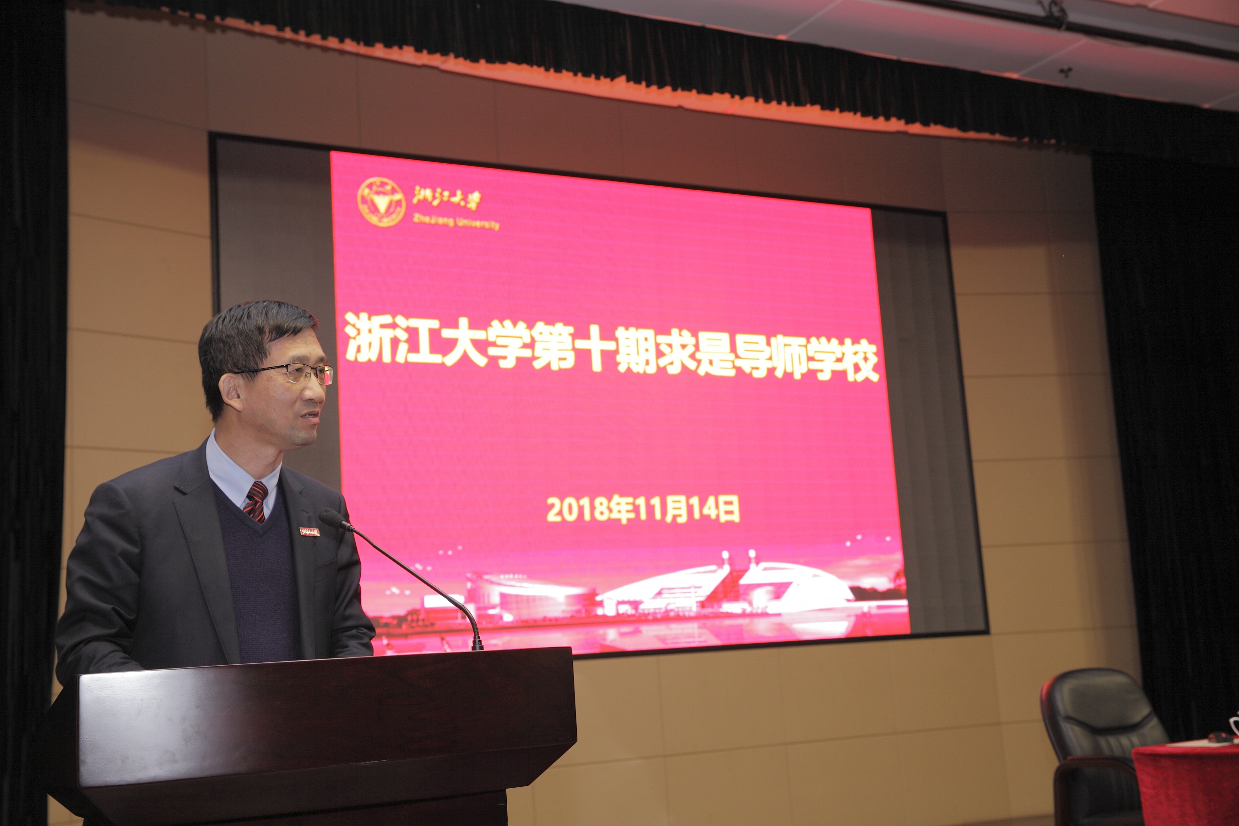 为深入学习贯彻党的十九大精神,系统落实全国高校思想政治工作会议、全国教育大会和学校第十四次党代会精神,以习近平新时代中国特色社会主义思想为指导,进一步落实导师立德树人职责,努力建设一支“政治素质过硬、业务能力精湛、育人水平高超”的研究生导师队伍,2018年11月14日,浙江大学第十期求是导师学校在紫金港校区临水报告厅隆重开班。浙大200余位新上岗导师以及50余位来自西湖大学、浙江工业大学、宁波大学和湖州师范学院等省内高校的教师代表参加培训。