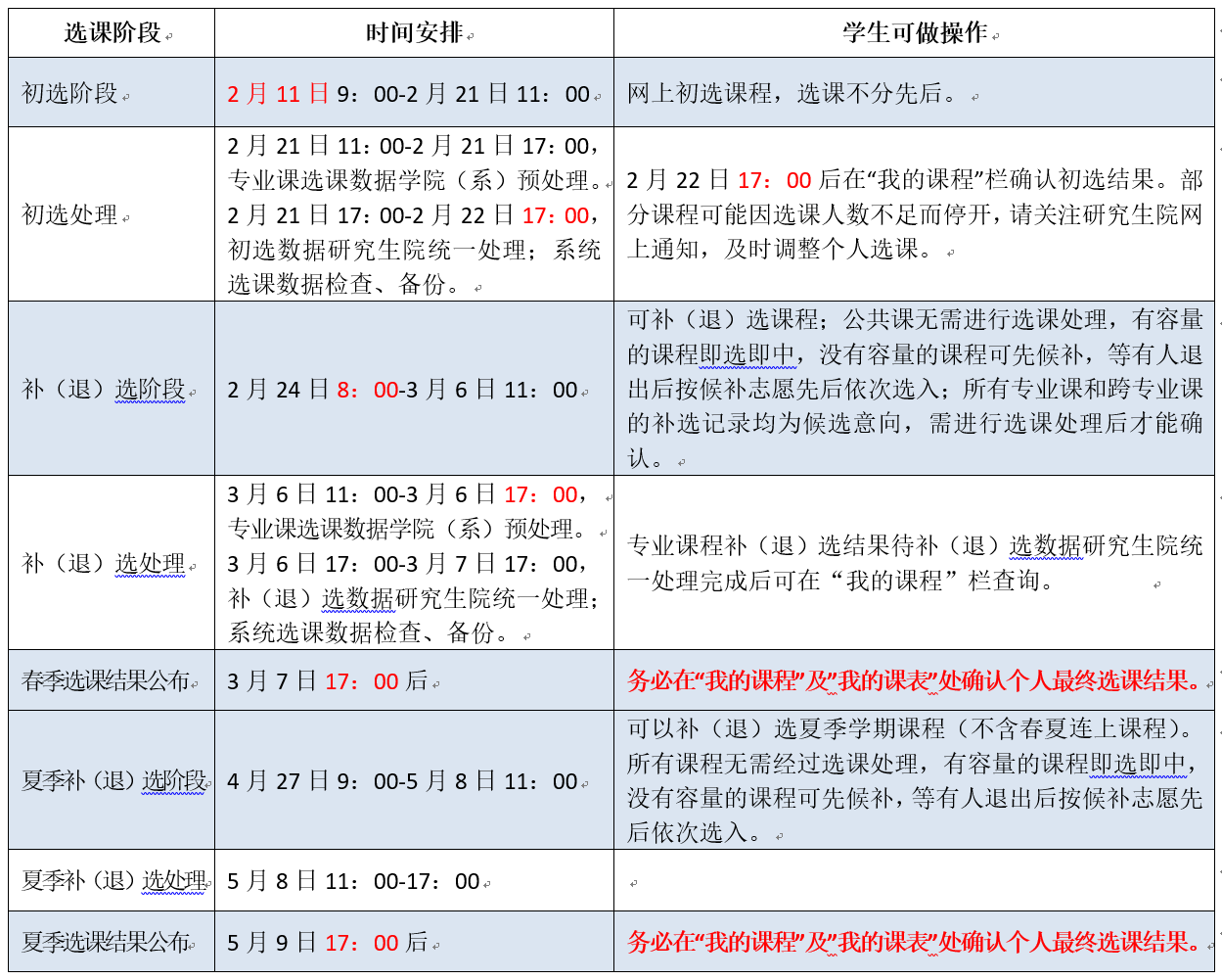 本次选课分初选、补(退)选、夏季补(退)选三个阶段,具体时间安排详见下表。