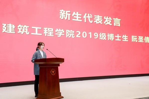 新生代表建筑工程学院2019级博士生阮圣倩同学发言,向各位领导、老师表示衷心的感谢,倡议同学们坚定信念,学以致用。