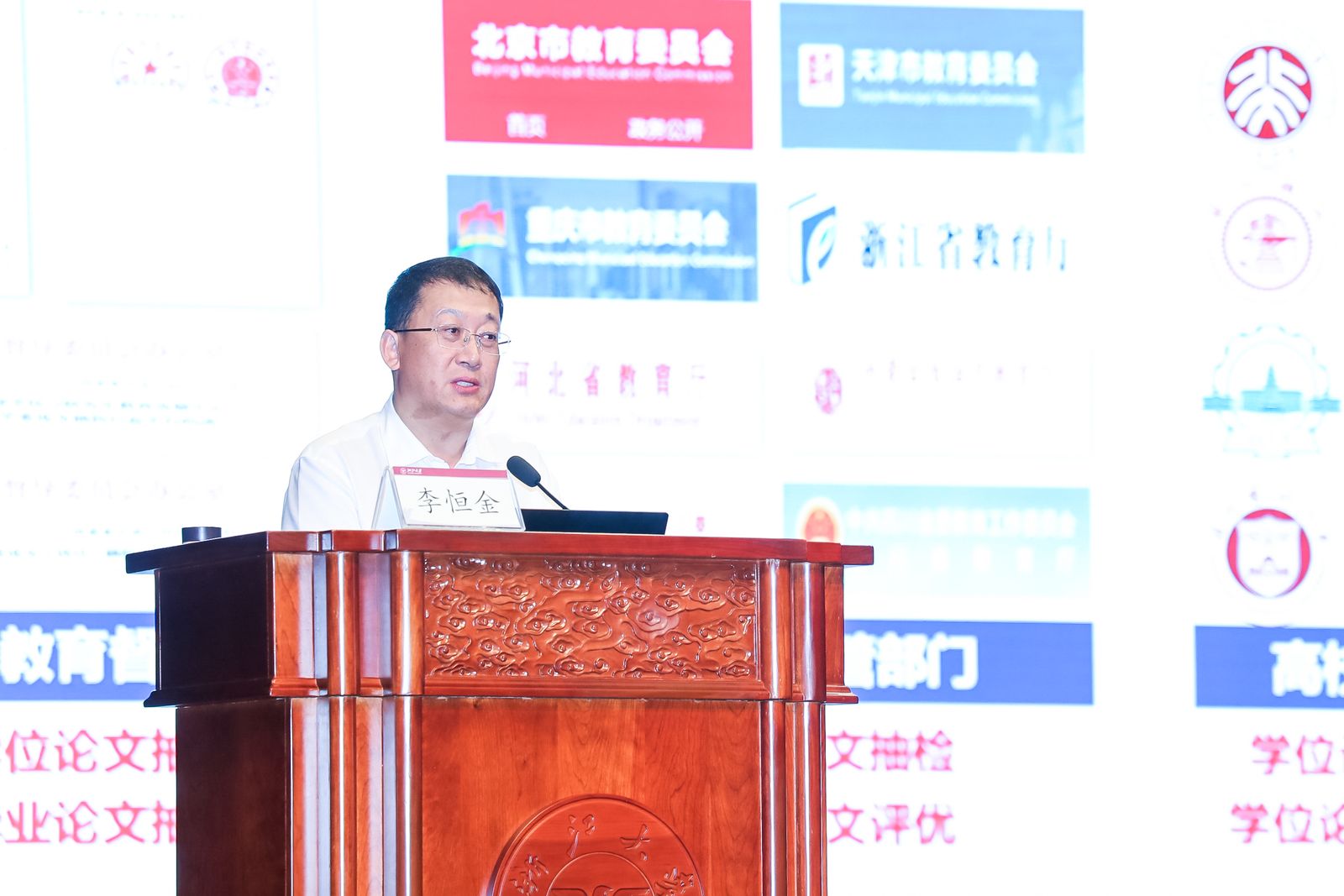 教育部学位与研究生教育发展中心论文质量监测处李恒金处长作《开展高质量学位论文质量监测服务,助力高层次自主人才培养质量提升》政策分析与解读。他指出保障学位论文质量是研究生导师指导行为准则中一项重要原则,结合新形势新要求详细解读了研究生教育系列重要文件并介绍了学位论文抽检的工作情况,希望在座各位导师进一步学习政策文件,严把过程关与出口关,切实提升研究生培养质量。